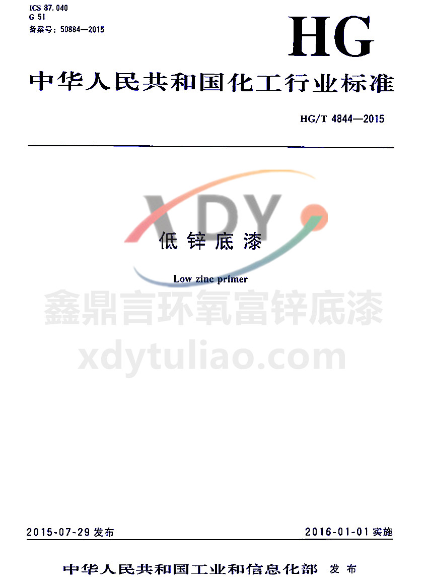 ICS 87.040 G51 備案號:50884-2005 HG 中華人民共和國化工行業(yè)標(biāo)準(zhǔn) HG/T 4844-2015 低鋅底漆Low zinc primer 2015-07-29發(fā)布 2016-01-01實施 中華人民共和國工業(yè)和信息化部 發(fā)布 本標(biāo)準(zhǔn)規(guī)定了低鋅底漆的產(chǎn)品分類、要求、試驗方法、檢驗規(guī)則、標(biāo)志、包裝和貯存。本標(biāo)準(zhǔn)適用于不揮發(fā)分中金屬鋅含量低于60%但不低于40%的低鋅涂