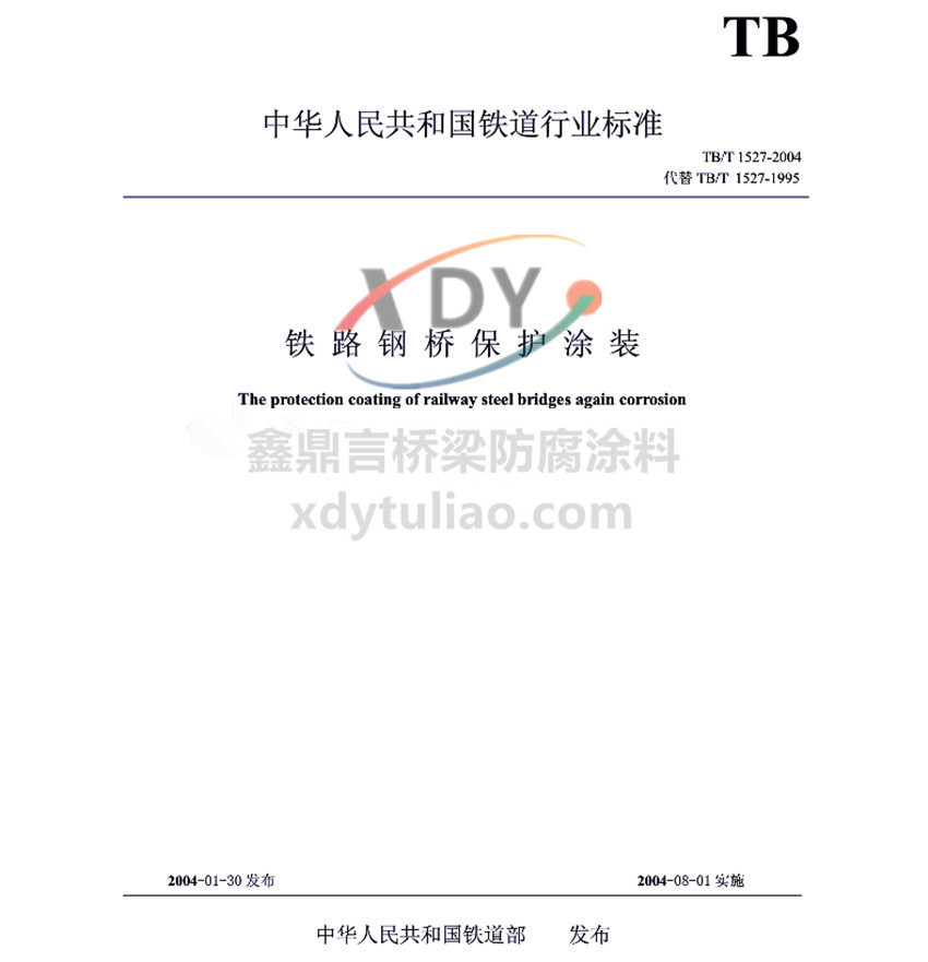 TB/T1527-2004鐵路鋼橋保護涂裝 中華人民共和國鐵道行業(yè)標準 TB/T 1527-2004代替TB/T 1527-1995 鐵路鋼橋保護涂裝The protection coatings of railway steel bridges aging corrosion 2004-01-30發(fā)布 2004-08-01實施 中華人民共和國鐵道部發(fā)布 本標準規(guī)定了鐵路鋼橋保護涂裝技術(shù)要求、試驗