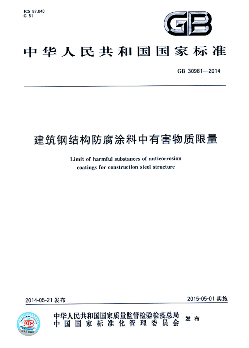 建筑鋼結(jié)構(gòu)防腐涂料中有害物質(zhì)限量標準GB 30981-2014 ICS87.040 G51 GB 中華人民共和國國家標準 GB 30981-2014 建筑鋼結(jié)構(gòu)防腐涂料中有害物質(zhì)限量 Limit of harmful substances of anticorrosion coatings for construction steel structure 2014-05-21發(fā)布 2015-05
