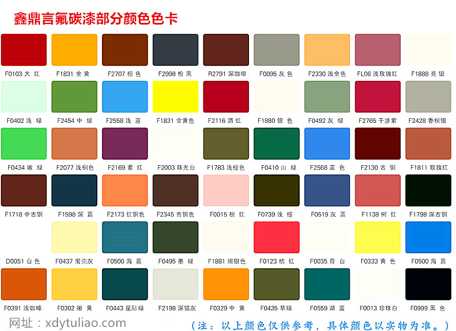 調(diào)色:氟碳漆顏色可按照防腐漆色卡(勞爾RAL色卡),標(biāo)準(zhǔn)色卡(國(guó)標(biāo)色卡)選色定做。亦可以按照客戶樣板定做。