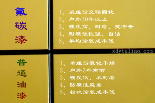氟碳漆與普通漆有什么區(qū)別? 本文從一下幾個(gè)方面全面的比較了氟碳漆與普通漆的區(qū)別比較:樹脂、固化成膜、耐候性、機(jī)械性能、耐溶劑性能、耐熱性、使用期限、市場(chǎng)價(jià)、可涂布面積、每平米每年的成本