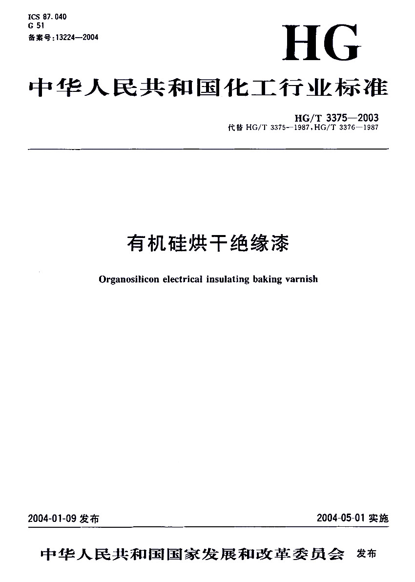 HG/T 3375-2003有機(jī)硅烘干絕緣漆標(biāo)準(zhǔn) ICS87.040 G51 備案號:13224-2004 HG 中華人民共和國化工行業(yè)標(biāo)準(zhǔn) HG/T 3375-2003代替 HG/T 3375-1987,HG/T 3376-1987 有機(jī)硅烘干絕緣漆Organosilicon electrical insulating baking varnish 2004-01-09發(fā)布,2004-