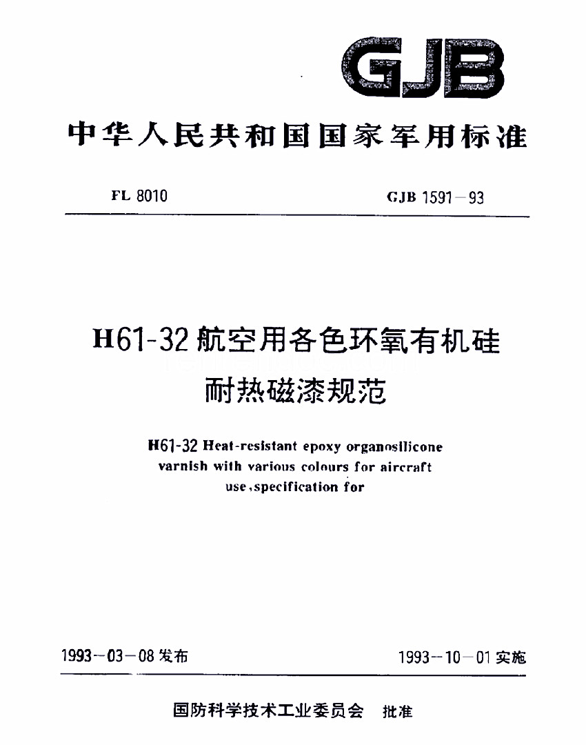 H61-32各色環(huán)氧有機(jī)硅耐熱磁漆標(biāo)準(zhǔn)GJB 1531- 93 GJB 中華人民共和國國家軍用標(biāo)準(zhǔn) FL8010  GJB 1531- 93 H61- 32航空用各色環(huán)氧有機(jī)硅耐熱磁漆規(guī)范 H61-32 Heat-resistant epoxy organosilicnne vrnish with various colonrs fnraircrufl use speciflc