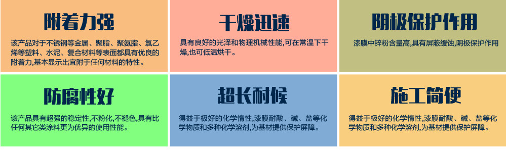 無機(jī)硅酸富鋅底漆又稱無機(jī)富鋅底漆,由烷基硅酸酯、鋅粉、顏料、添加劑和固化劑等組成的濕固化雙組份防腐涂料。XDY-FX716無機(jī)硅酸富鋅底漆具有以下主要特性:陰極保護(hù)作用和防銹性優(yōu)異;干性快,只需在很短的時間即能搬運、堆放和涂裝后道油漆;具有優(yōu)異的耐熱性,漆膜可經(jīng)受400℃的高溫,焊接切割時燒損面積;優(yōu)良的低溫固化性能;優(yōu)良的耐水性、耐鹽霧和耐溶劑性能。XDY-FX716無機(jī)硅酸富鋅底漆作為造船廠、重型機(jī)械廠等鋼材預(yù)處理流水線的車間底漆。也可用作海上平臺、碼頭鋼柱、礦井鋼鐵支架、橋梁、大型鋼鐵結(jié)構(gòu),作高性能防銹漆之用。亦可用于高爐熱風(fēng)爐外壁以及煙囪、煙道、烘道、高溫排氣管道加熱爐和其它金屬要求耐高溫防腐設(shè)備的專用漆。