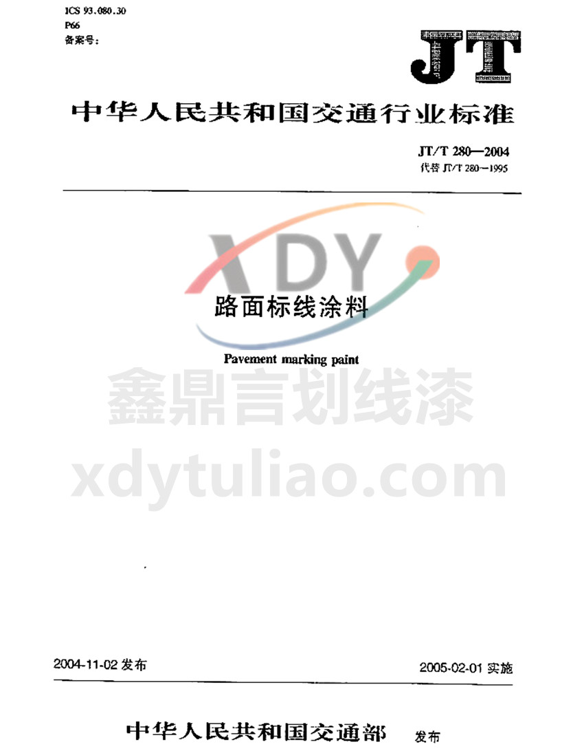 JT/T 280-2004路面標(biāo)線涂料標(biāo)準(zhǔn)是防腐涂料小編照搬JT/T 280-2004《路面標(biāo)線涂料》紙質(zhì)版內(nèi)容,大家可以放心參考。更多防腐涂料執(zhí)行國家和行業(yè)標(biāo)準(zhǔn)等防腐涂料相關(guān)信息可以參考官網(wǎng):m.spwww.cn ICS 93.080.30 P66 JT 中華人民共和國交通運(yùn)輸行業(yè)標(biāo)準(zhǔn) JT/T 280-2004路面標(biāo)線涂料Pavement